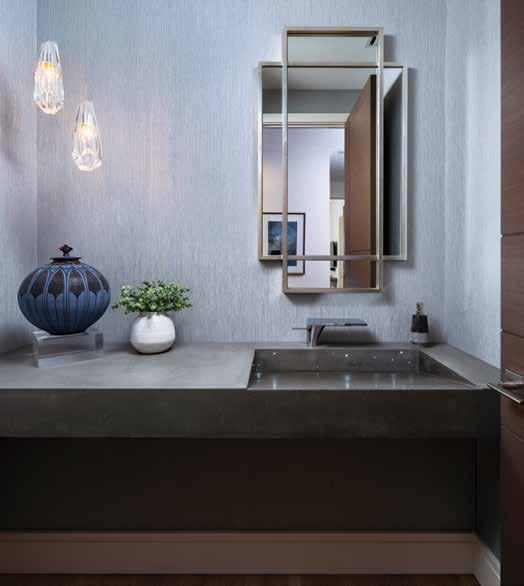 The homeowners wanted an open floor plan that would better capture the views and a modern design, opposite of their traditional Virginia home, but not so modern that it wouldn’t be comfortable. “It’s such a unique property, and the homeowners understood the design had to do justice to the property,” Sample says. “They wanted to strike a balance with a design that was special and unique but also in sync with their core goal of having a family-centered home that is welcoming, relaxed, and livable. It was also important for the design to be based on classic elements that would stand the test of time.” Lighting Designer Monika Oberer with Light Up Your Life and Luxury Home Builder Scott Frieler with Frieler Construction round out the team on this project. u