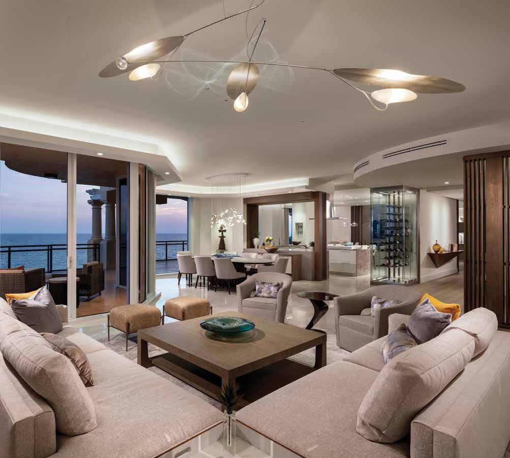 Of course, not only the lighting is specific to the homeowners. Careful consideration went into the way they intended to live in the space. There’s abundant room for entertaining friends and family, plus various seating arrangements, including swivel chairs in the living room so guests can view the water or converse with people in adjoining areas. The cozy family room has a game table with a nearby wet bar. Alleviating allergens is a particular concern for the wife, so hard surface flooring from Oracle Flooring — accented by a few low-pile area rugs — was specified for the entire home. While the homeowners didn’t explicitly request a “showplace” or a “glamorous” home, the finished product certainly fits the bill. The home is a perfect match for its truly one-of-a-kind location. n