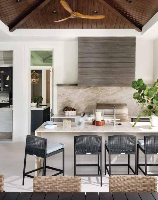 The primary bath was thoughtfully reconfigured to maximize its utility, with a luxurious soaking tub on the right and a spacious shower on the left, complete with a rain head, fixed head, and handheld. This new layout also facilitated the creation of a generously proportioned closet area, providing additional storage solutions. Outdoors, the opulent new kitchen offers top-of-theline appliances, custom cabinet drawers, and a fullheight backsplash. New tiling graces the pool area and surroundings, while an elegant cypress ceiling detail elevates the outdoor ambiance. The former sand set pavers have given way to porcelain tiles throughout the outdoor living space, creating a fresh, timeless setting for indulgence like never before. u