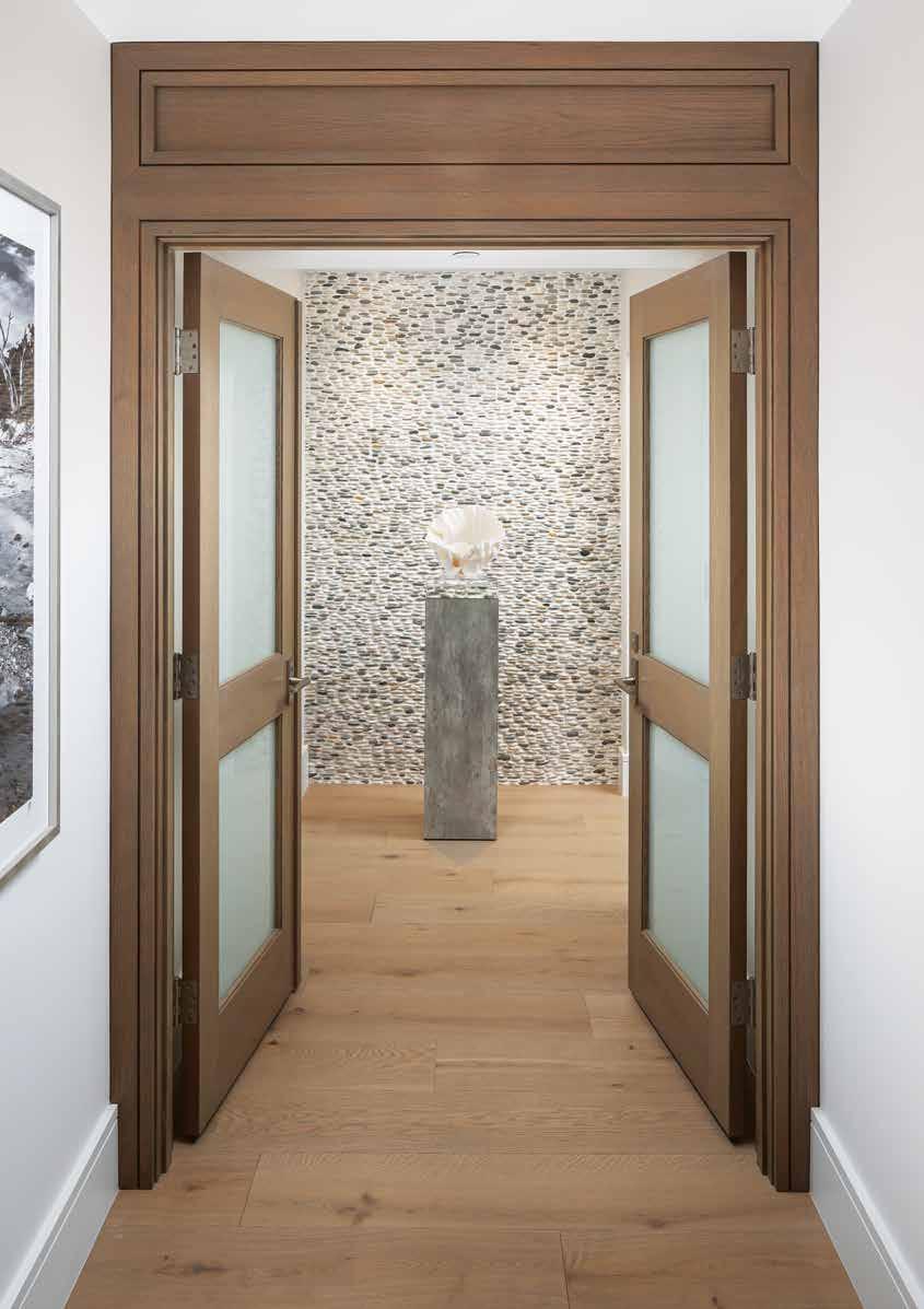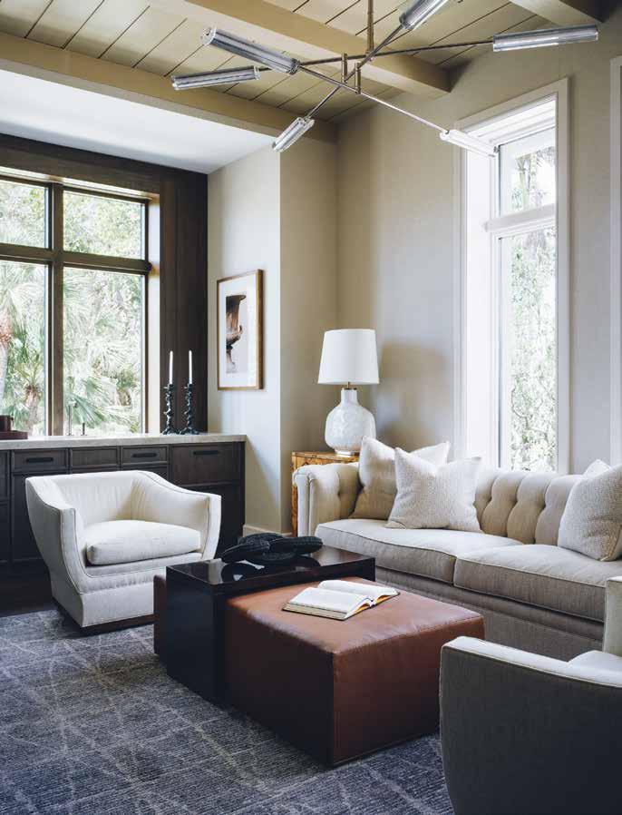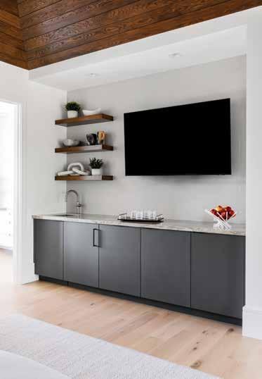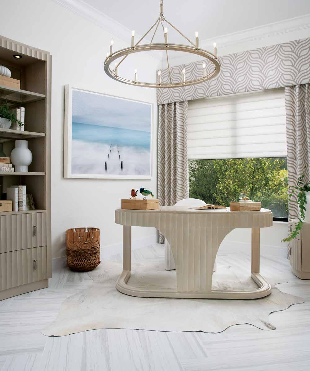 Features like the wine room, bar, and club room elevate the home’s appeal. The wine room, just off the kitchen, is a unique design that sparks conversation — floating shelves traverse a window, showing the vibrant living backsplash of the foliage outside. Muted blue and warm tan accents contribute to the great room’s serene aesthetic, a gentle contrast that enriches the space without overwhelming the calming effect of the predominant grays, beiges, and wood tones. Brown selects these shades from the beachside artwork that evokes that laid-back beachy vibe.