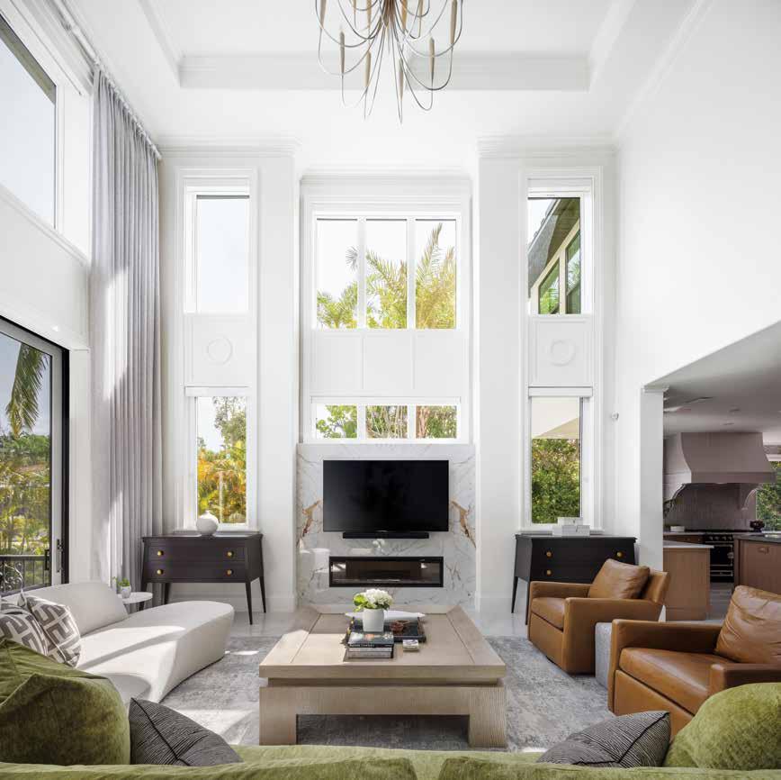 Great Room: Beiler, along with his highly skilled team of craftsmen, brings Rodriguez’s intricate millwork design to life, seamlessly unifying the expansive wall area and the spaces between the newly replaced windows with perfectly aligned millwork. Custom linen-textured drapery from Angela Rodriguez Interiors cascades from the 20-foot ceilings, adding drama to the room. Meanwhile, the palm frond green chenille sofa and caramel leather club chairs draw inspiration from the natural hues visible through the windows.