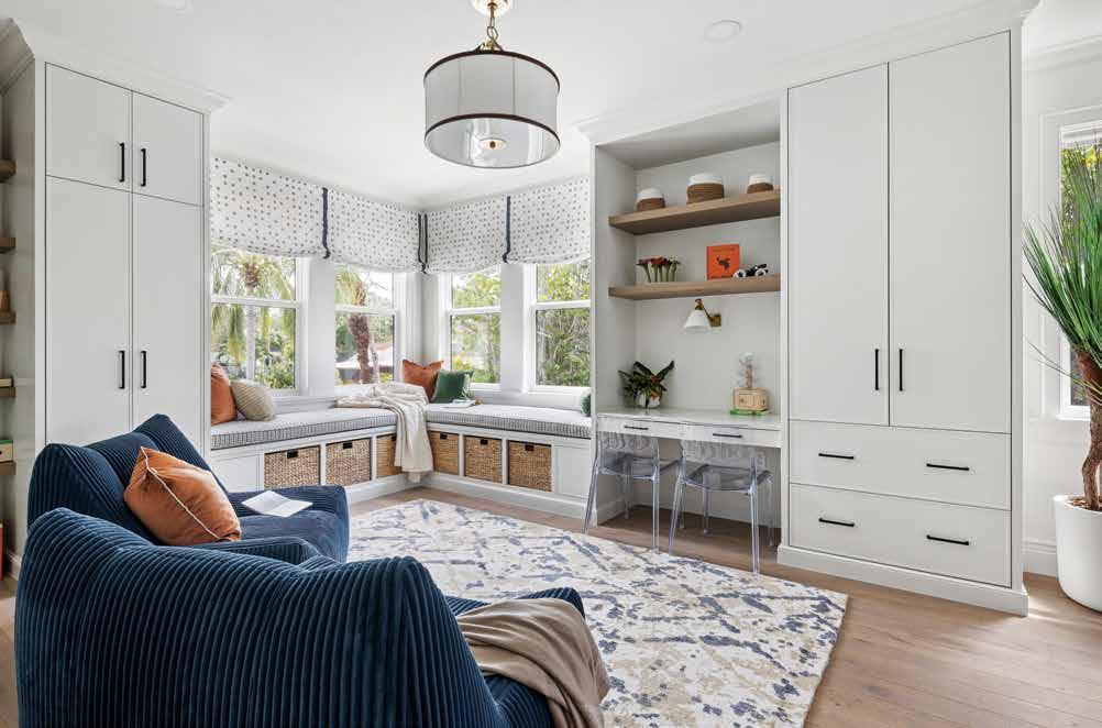 Loft: This versatile loft can be a playroom, homework area, or hangout space. Rodriguez custom-designed the built-in storage, combining open and closed sections to accommodate various needs. Playful colors like midnight blue and rust add vibrancy to the design, while the area rug and window treatments introduce delightful patterns that enhance the room’s energetic feel. For moments of quiet reflection, the cozy custom built-in bench offers a serene view of the canal.