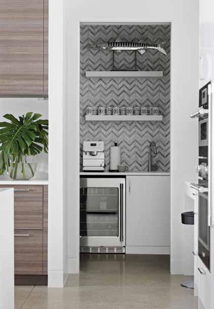 Pantry: “The kitchen pantry took on a life of its own,” says Voigt. The design intentionally limits countertop space to accommodate a compact coffeemaker, and a small wine refrigerator sits just beneath it. Above the equally small sink is a chevron patterned mosaic marble backsplash that leads the eye to the adjacent laundry room, which mirrors the white cabinets and diamond white quartz countertops seen in the kitchen pantry.