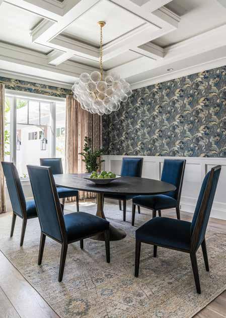 Formal Dining Room: “The walls below the chair rail feature classic millwork detailing, further elevated with the use of silk wall covering in each recessed panel, repeated in the ceiling,” says Liz Brown, Lead Designer at Calusa Bay Design. “A gorgeous floral wallcovering above the millwork adds a pop of pattern to the space. The light fixture is fun and feminine, with hand-blown glass bulbs reflecting the light. The brass hardware is repeated on the metal base of the table with chairs upholstered in rich blue velvet.”