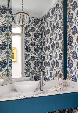 Powder Room: The powder room, adjacent to the dining room, features a vessel sink and a bold blue and white wallcovering. The cabinetry was painted a perfect blue to nicely coordinate. “Wallpaper is clearly making a comeback as it adds depth, texture, and color. We are using it more and more,” shares Brown. A beaded chandelier with rope detailing adds a soft casual feel to this bathroom. The countertop material is man-made quartz with bold blue veining running through it to continue the theme.