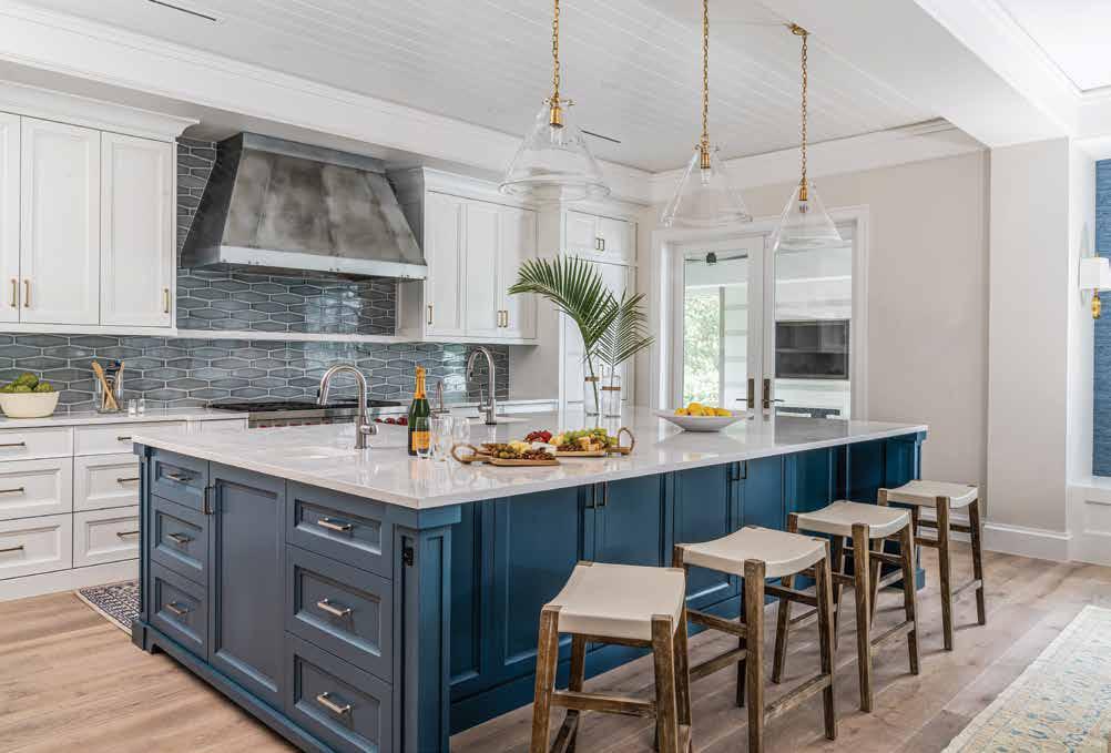 Kitchen: “We obtained large slabs of indestructible man-made quartz material for the island countertop,” says Brown. “The handmade ceramic backsplash tile was fabricated in a unique elongated diamond shape — repeated in different elements throughout the kitchen.” The custom tapered range hood above the Wolf stove was crafted in a distressed pewter and accented with brass rivets. Beautiful white perimeter cabinets are perfectly combined with a rich blue island. Sub-Zero and Wolf appliances throughout the kitchen are from Ferguson Bath, Kitchen & Lighting Gallery.