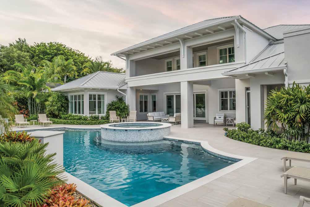 Rear Elevation: “While the shape of the pool and spa remained the same after the renovation, a full resurfacing and tiling added a burst of renewed energy, along with new landscaping surrounding the home and pool area,” says Radick. The new pebbling of the pool in a Tahoe Blue color gives off a tropical flair, rounding out the outdoor area’s makeover. Motorized hurricane shutters and motorized insect screens were installed by Castle Services of Southwest Florida.