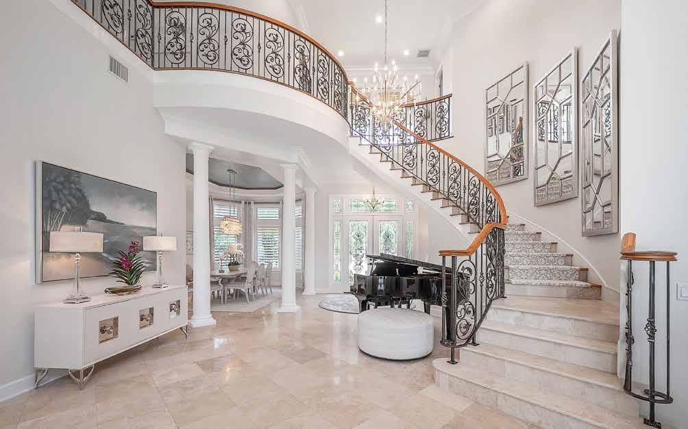 Grand Entrance/Foyer: A dramatic curved staircase makes a stunning first impression in the home’s entry, where McKinlay Rose Interiors transformed original elements by refinishing them, adding a soft custom runner, and incorporating mirrored accents. The design maximizes reflection and light, with a scale-appropriate chandelier anchoring the space. “We want you to feel like you’ve stepped into something serene and luxurious from the moment you enter,” McKinlay says.