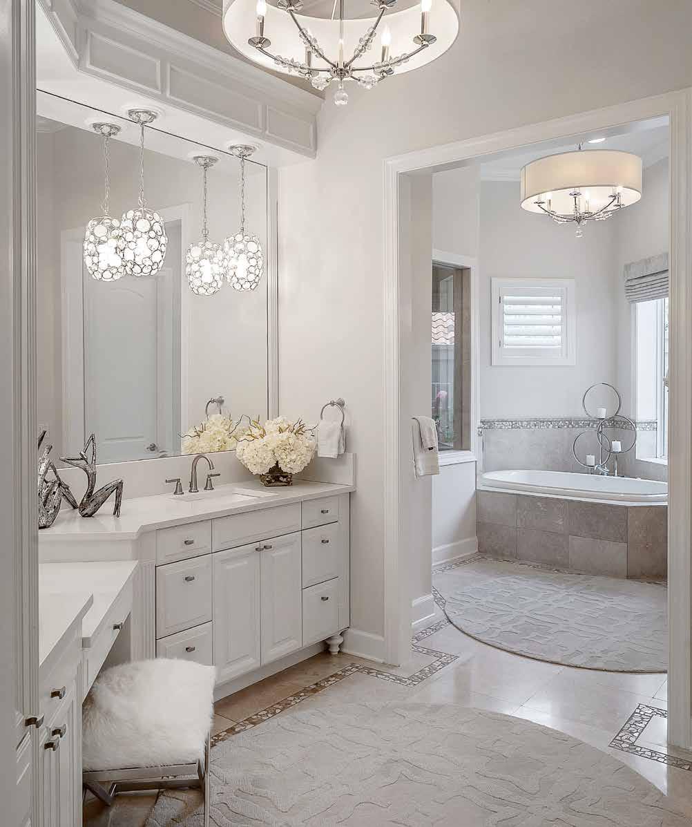 Primary Bathroom: Pendant lights with mother-of-pearl inlays soften this highly customized bathroom, where stone details and crisp white cabinetry coexist with silk drum shade chandeliers and pendant lighting that adds sparkle. Custom rugs tailored to fit the unique shapes of spaces showcase the care designers invest in every selection. A consistent color palette connects the area to the adjoining bedroom, creating a seamless, spa-like retreat.