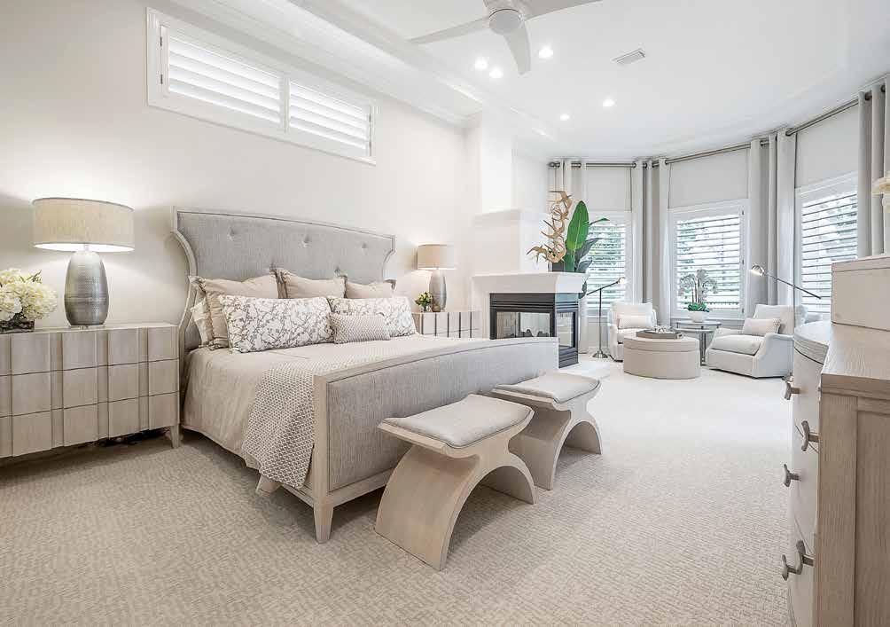 Primary Suite: A stunning wooden sculpture from John-Richard hangs above the fireplace, while furnishings from Bernhardt add an elegant touch. This includes a fully upholstered headboard and a pair of curved benches at the foot of the bed, which enhance the room’s sophistication and movement. A cozy reading nook features accent chairs from Universal Furniture, providing a relaxing space to unwind at the end of the day. The wall-to-wall carpet, reminiscent of soft sand, adds texture, and a door leading directly to the backyard and pool area completes the serene atmosphere, showcasing a subtle palette inspired by nature’s elements.