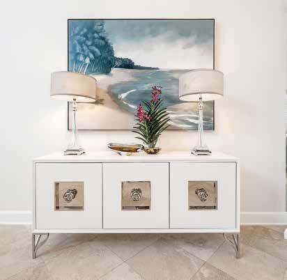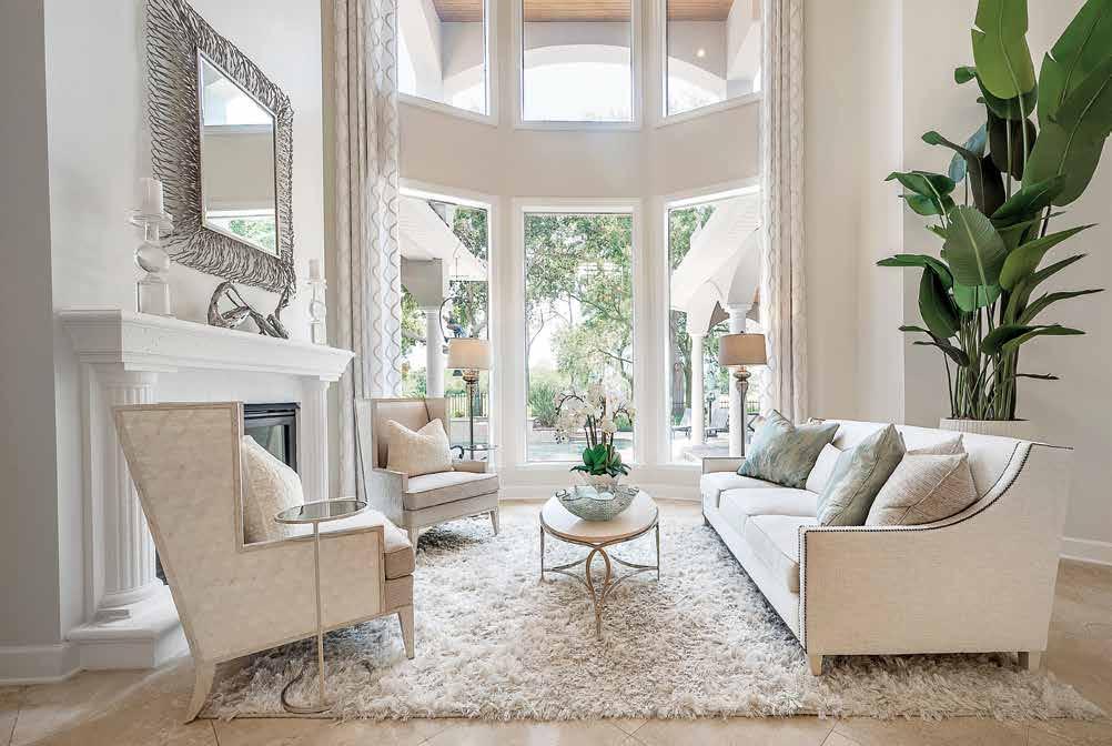 In the living room, full-height drapery accentuates soaring ceilings, while high-backed wing chairs and a plush sofa create intimacy without sacrificing impact. Shell-inlaid chairs and silver-leafed pieces add textural interest. “Every item is selected for that specific client — nothing is cookie-cutter,” Rose notes. u