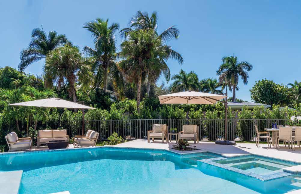 Pool: The pool’s unique shape, designed to complement the property’s uniqueness, sets the stage for a harmonious outdoor oasis. Adorned with Christmas palms and Alcantara, the pool deck exudes tropical charm, while artificial turf reduces maintenance. Fragrant bougainvillea, white hibiscus, and gardenia further enhance the atmosphere. Multiple entry points seamlessly integrate the pool with ample in-water seating adjacent to the spa. A thoughtfully sunken fire pit area optimizes the use of every corner, transforming the space into a harmonious and inviting outdoor oasis.