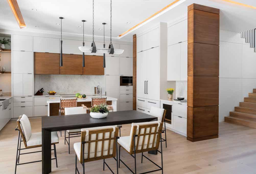 Kitchen & Dining Room: “For the ceiling design, I created a continuous reveal around the kitchen perimeter, flowing seamlessly into the living room. It is clad in wood and highlighted with cove lighting to create unity,” says Prerost. Walnut wraps the freestanding bank of cabinets for a furniture-like look. The dining chairs combine contemporary black metal, warm walnut, and relaxed tie-on cushions from Four Hands. The exquisitely crafted white oak stairs were designed to deliver striking architectural detail.