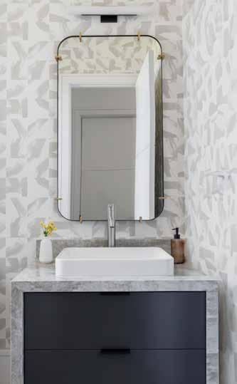 Primary Bathroom: Prerost designs the vanity with a plunging white quartz countertop, creating the illusion that the cabinets rest effortlessly on the quartz base — another display of converging forms. A generous linen tower with built-in decor shelves cleverly conceals structural elements, making the entire vanity wall a seamless integration of functionality and style. The Calacattainspired porcelain tile from Ruben Sorhegui Tile introduces subtle movement to the floor, gracefully guiding the eye toward the luxurious soaking tub from Ferguson Bath, Kitchen & Lighting Gallery.