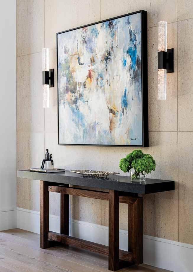Entry: The client had a vision for an entry console and created the custom design with a stone top from Set in Stone Countertops. “We exchanged sketches, fine-tuning the design together,” Prerost explains. “He built the base, and I helped with the scale, finishes, and sourcing a locally made stone top.” The same limestone as the exterior cladding by Limestone Dimensions is intentionally used as the backdrop in the foyer. Flanking this abstract art are two sleek Hammerton Studio scones.