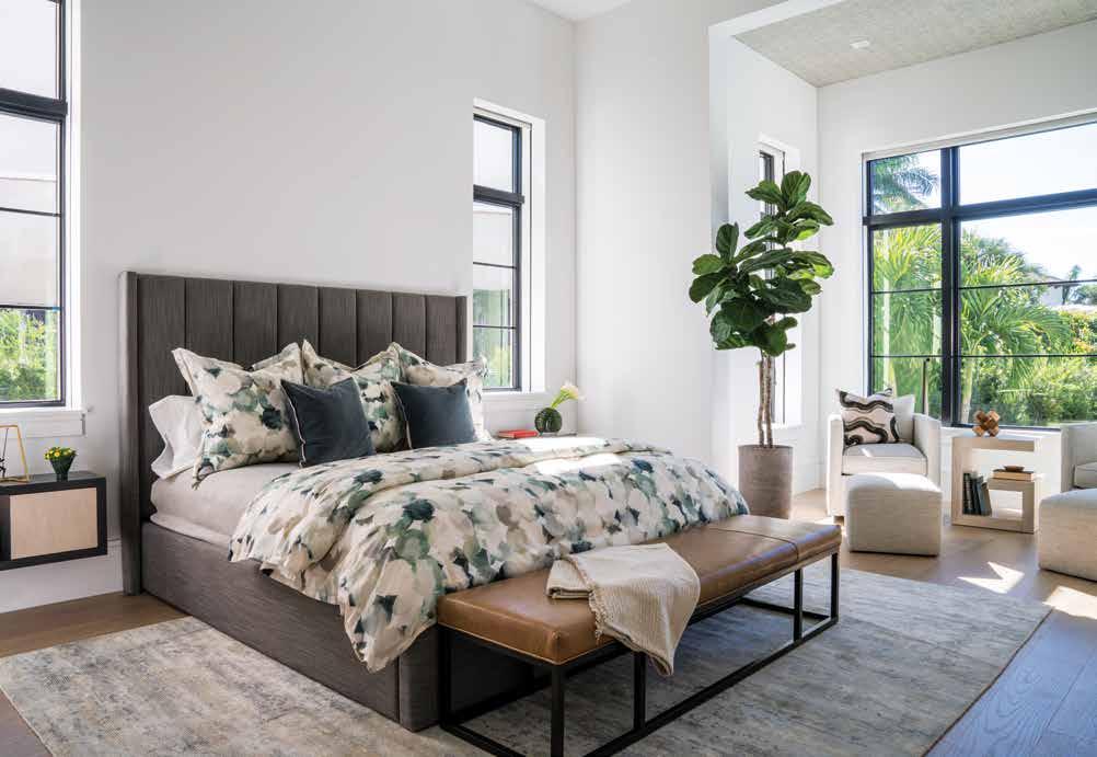 Through generous openings, the guest rooms overlook the uniquely shaped pool, where Prerost brings the blue and brown tones to the pool tile. The architecture, landscape, and interior design of this vacation home combine comfort and modern elegance, embodying the expression of ‘Subtropic Chic’. n