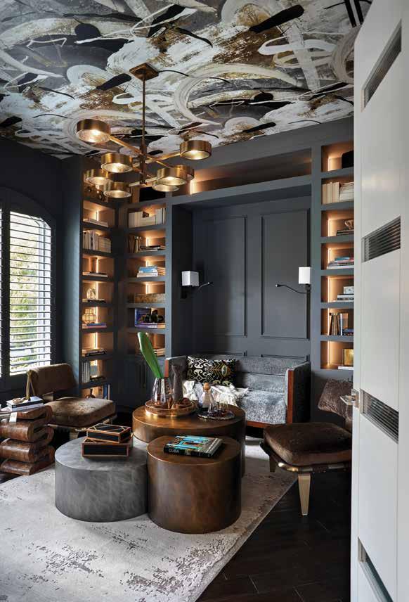 This study went from old school, dated, and boring to a book-lined, whiskey haven. The client wanted a space to retreat to where they felt warm, comfortable, and enveloped. The walls were clad in trim and bookshelves — floor to ceiling — painted in ink blue. Copper, chocolate suede, burnished gold, and a large-scale print applied to the ceiling added an air of soulful sophistication.