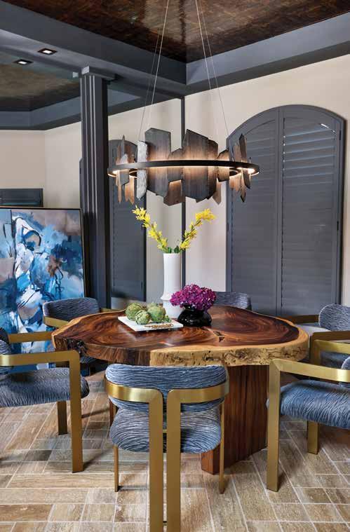 For this home, we covered the existing stone fireplace with wood tile and Emperador dark-honed marble. The result is a cozy and textured centerpiece for the living room. To further enhance the ambiance, we added art, sculptures, and mood lighting to the area. The dining room was transformed into a stunning space by adding a beautiful copper ceiling, sophisticated inky blue touches, a magnificent Crystallo chandelier, and a live edge table surrounded by mid-century modern chairs with burnished gold frames. Custom art, lighting, and sculptures were also incorporated into the room to enhance its overall appeal.