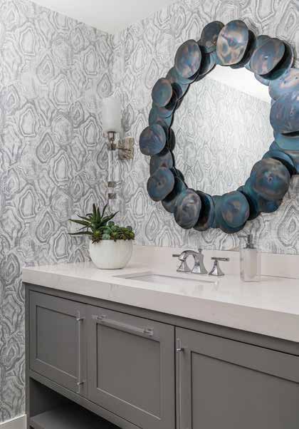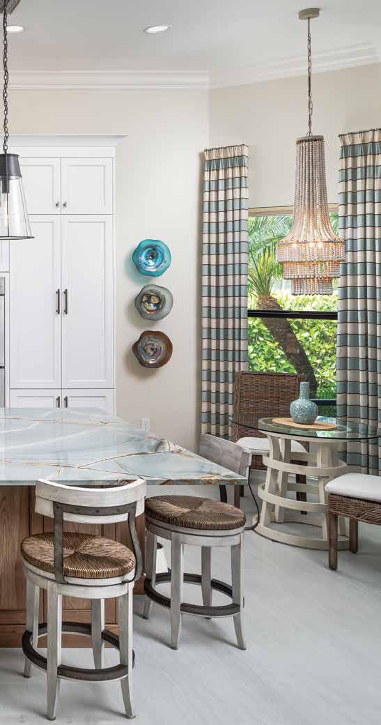 Interior Designer Dwayne Bergmann transforms a classic design into modern luxury using contemporary forms and luxe finishes, with touches of transitional details reflected in the primary bathroom’s beautiful drapery panels and cabinetry details. Bergmann used soft neutrals and light champagnes with an added touch of blue to bring in the colors of the Gulf and add some tranquility to the space.