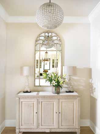 Foyer: Knapp selects many of the accessories and furnishings in either matte, weathered, gilded, or French reproduction to give the impression that every piece was found over time. “The foyer is an appealing cohesive blend of French and country cottage,” delights Knapp. The filigree on the antique mirror speaks to the baroque-style table lamps on this classical-inspired marble top credenza. Overall, this foyer ushers in the comfort of French countryside elegance.