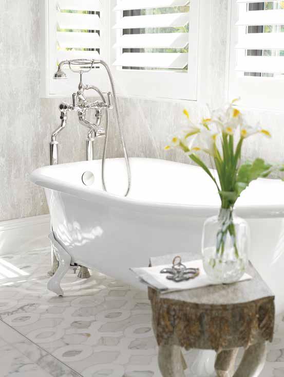 Primary Bathroom: The pure white ball-and-claw tub and the reproduction stag leg end table are absolutely French inspired. Knapp envelopes this bathroom in Osborne & Little wallpaper in various shades of off-white, cream, gray, and taupe to give the impression of a faux finish. Beneath the tub is a mosaic of white Thassos marble and Calacatta gold marble from Ruben Sorhegui Tile, which Knapp repeats in the shower for warmth and interest.