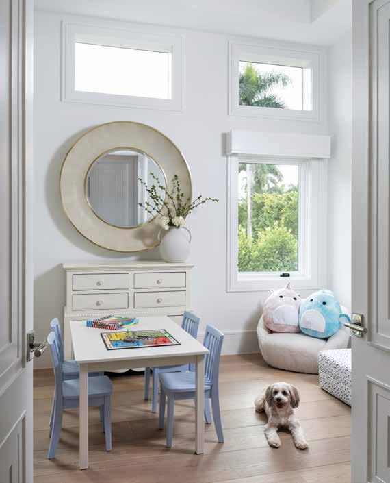 Kid’s Room: The homeowners wanted a place to entertain their young grandchildren just off the primary suite. Lyons chose interior doors — for this room and the rest of the home — with a bit of bling. “I thought this panel design was beautiful for adding to the upscale, elegant look of the house while mirroring the lines in the rest of the home,” she says. “It’s clean, modern, a little transitional, and gives them a beautiful detail for their doors.”