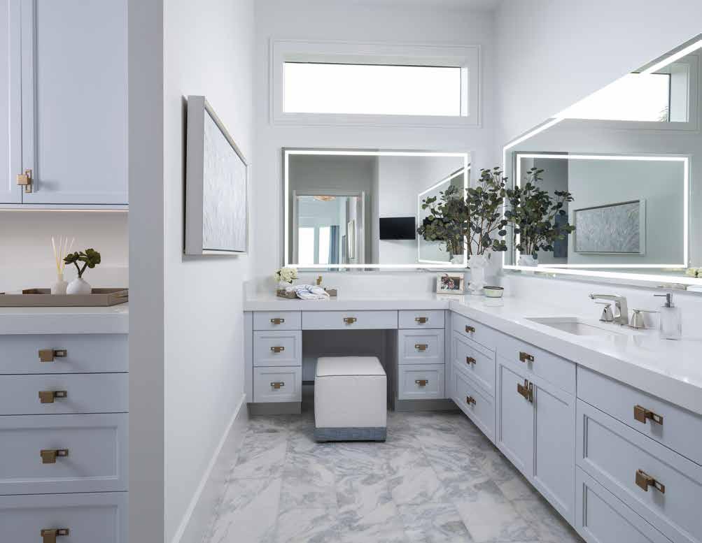 Primary Bathroom: The primary bathroom features floor tiles with a hint of blue, which inspired Lyons to match the cabinetry from SOHO Kitchens and Design to the kitchen island’s color. Her side of the bathroom includes lighted mirrors, a makeup area, ample storage, and elegant quartz countertops with a mitered edge. This U-shaped layout connects her side to his side and a shared shower. The cabinet hardware complements the kitchen’s finish while offering a fresh shape.