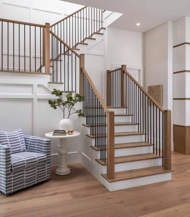 Staircase: Lyons designed a fresh look for the staircase with a white-on-white wainscot contrasting with the rich wood stair treads and railing. The way the staircase juts into the room provides a perfect reading spot with a single chair and table. This thoughtful detail creates a visual “moment” that offers a soft place for the eye to rest while appreciating the open floor plan.