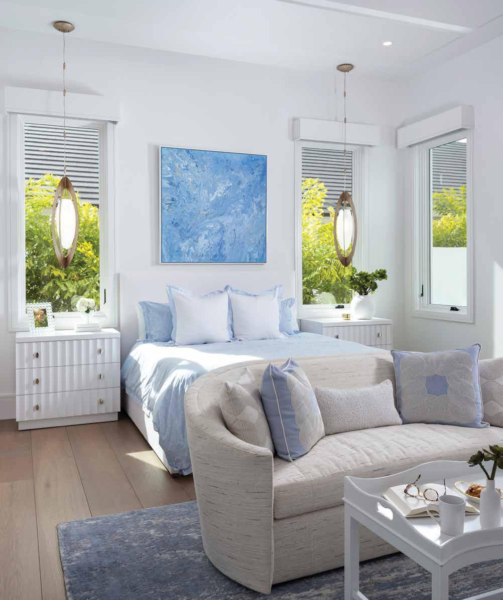 VIP Suite: Lyons aims for unique designs in each room while maintaining a cohesive look by using lighting with similar materials, such as the Fine Arts Lamps pendants from Naples Lamp Shop. “We wanted something unique and different for the VIP suite, and I love the color. They have a bit of that gold tone we’re bringing through the whole house, and they’re a little more unexpected, so we thought they were perfect for something a little different in this bedroom,” she says. Additionally, she designed a custom ceiling treatment and casings to conceal the window shades.