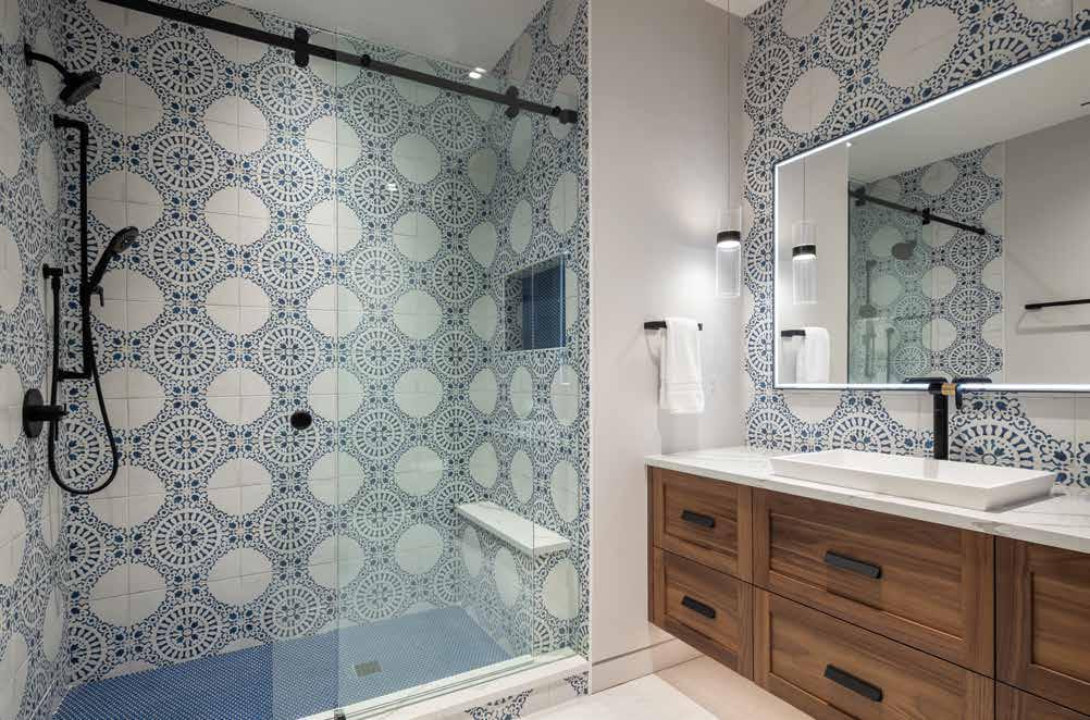 While not all spec home finishes will match a homeowner’s style or taste, with the right interior designer, this seeming problem can be transformed into a stream of possibilities. Working with Marla Oppenheim and Marsha Ritter of Mtoo Interior Design for Pizzazz, the existing tile, flooring, and paint became the canvas for a bespoke new design that matched the new resident’s elegant sensibilities and active lifestyle. u