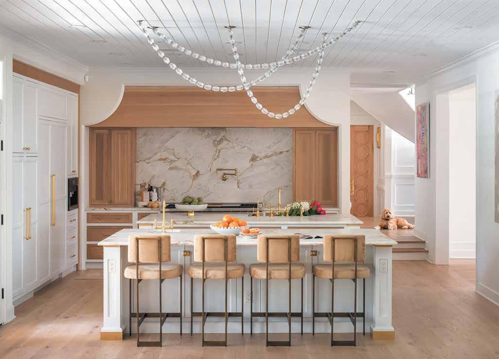Eye-catching wall coverings, even on some ceilings, impart color and texture in multiple rooms, while the open great room and kitchen were defined by tasteful rugs supplied by International Design Source. The most impact was made in the choices of fine furnishings, distinctive art and accessories, and refined lighting that pronounce the personality of the home and its owners. n