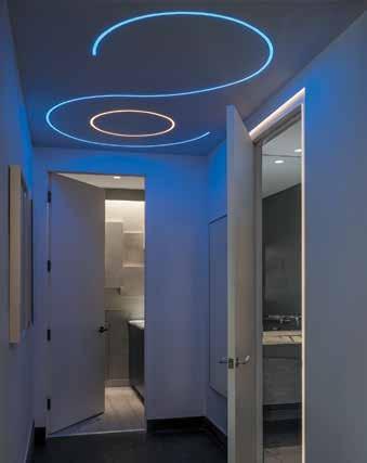 They began with large-scale porcelain tile with metal accents that highlight the procession through each space. Meticulous placement of architectural ceiling lighting allow the space to serve as a backdrop for the client’s contemporary art collection. Touches of whimsy are found in the handcrafted dining chandelier, glass and metal wall installation, and the geode-inspired wall covering in the laundry room. u