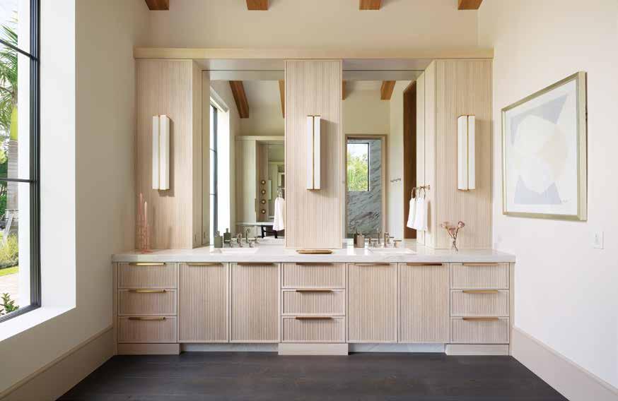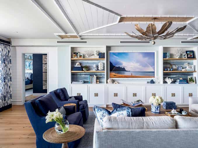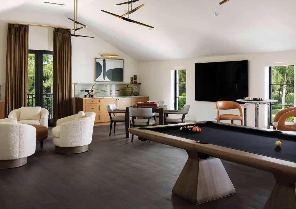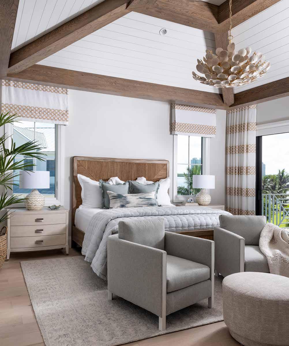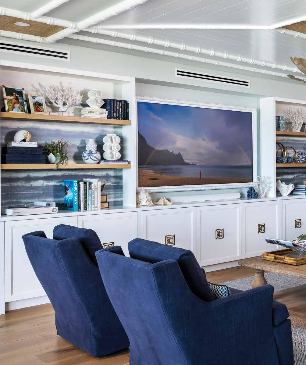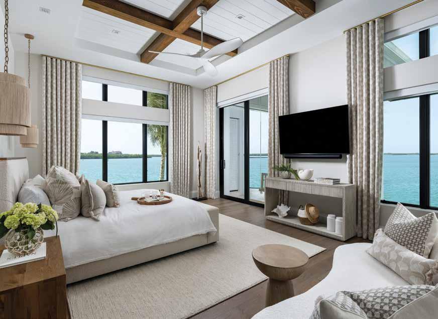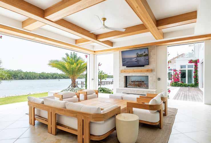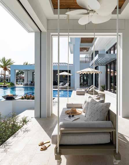 This property has exceptional water access and views, so the outdoor elements are equally important. McHenry curates destinations — from turf areas for play to tranquil fire bowls around the vanishing edge pool for ambiance into the evening. For the avid fisherman, Abad hooks every need on the first pass to design a fishing pavilion with ample storage, an ice maker, and a private bath — all linked to the dock by a gently sloped ramp that underscores the home’s practical luxury. With every challenge met, the house is both a fisherman’s dream and a family’s coastal paradise. n
