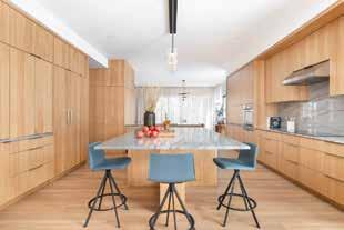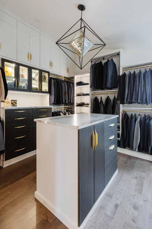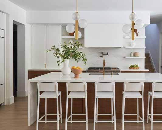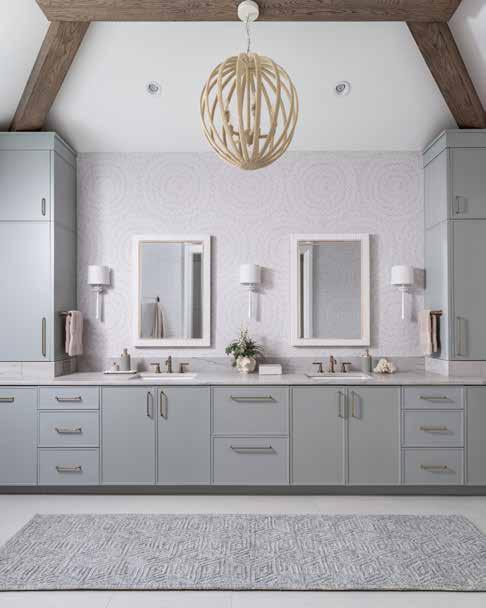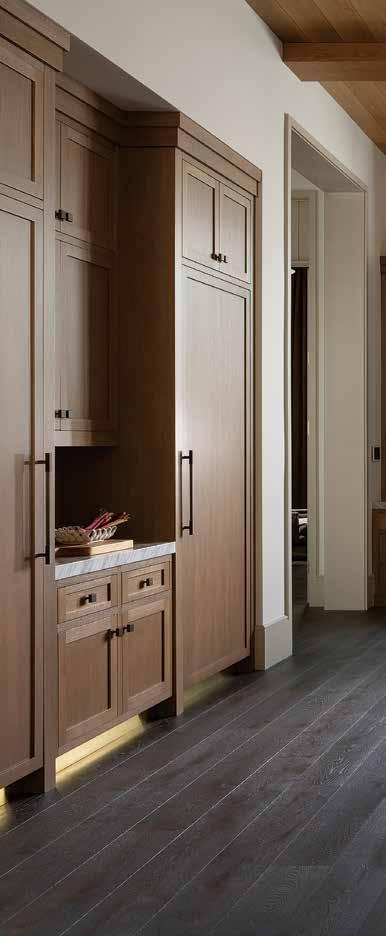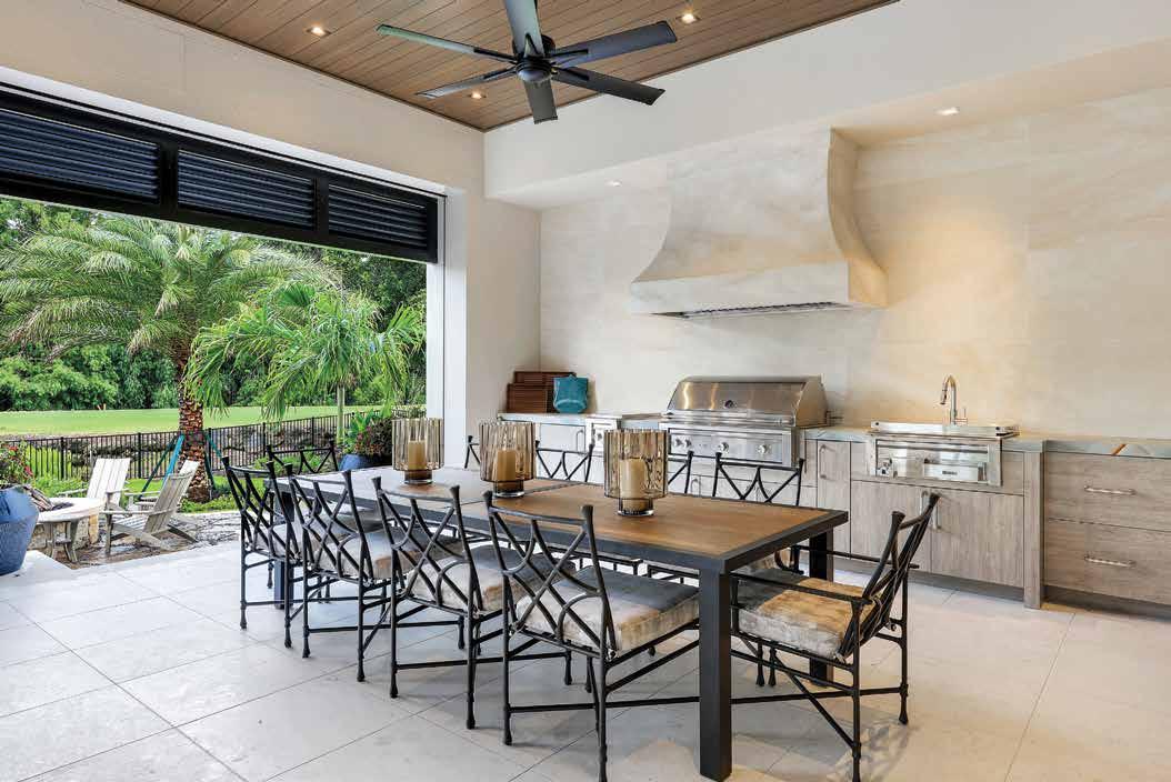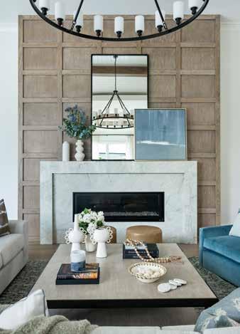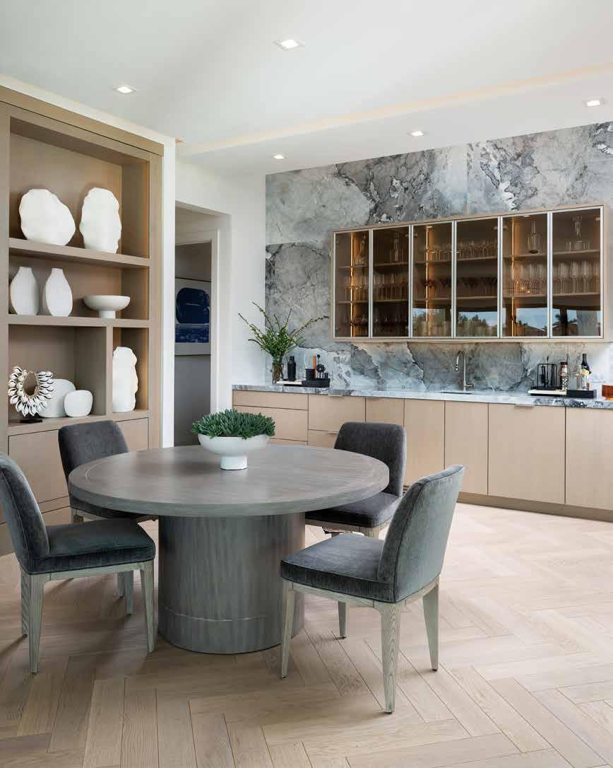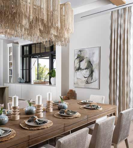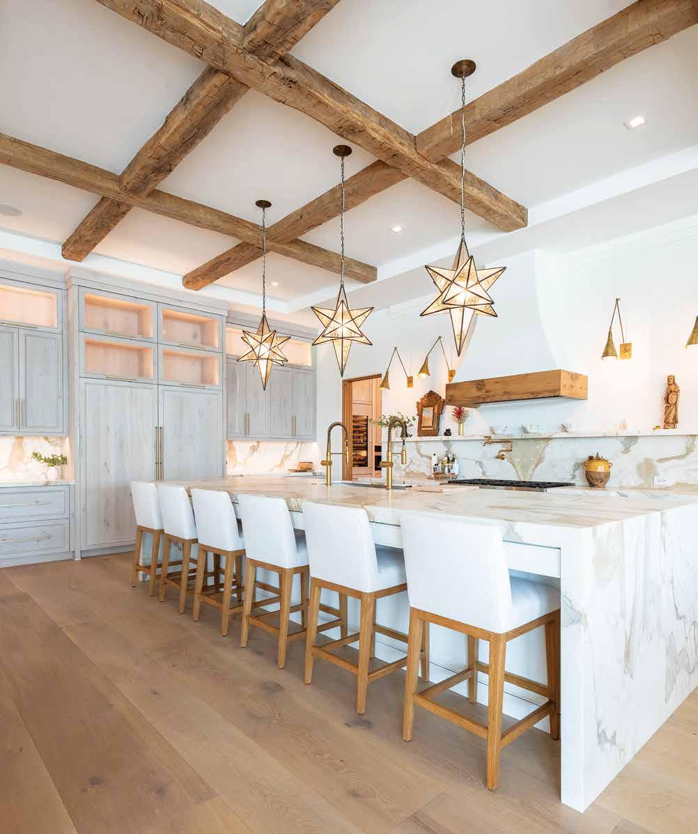 Dining Room: “Minka truly captured the blend of coastal contemporary and hunting lodge,” says Lykos. “We have a white ceiling with substantial wood beams instead of all wood, striking a balance that represents both styles very well.” Above the robust table from Four Hands is a twiginspired chandelier from Currey & Company — blending these styles with refinement. A built-in serving station, topped with Black Vermont quartzite in a river-washed finish from UMI Stone, repeats that material from the outdoor kitchen.