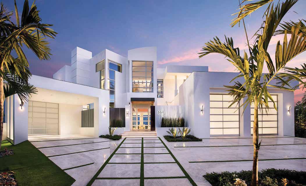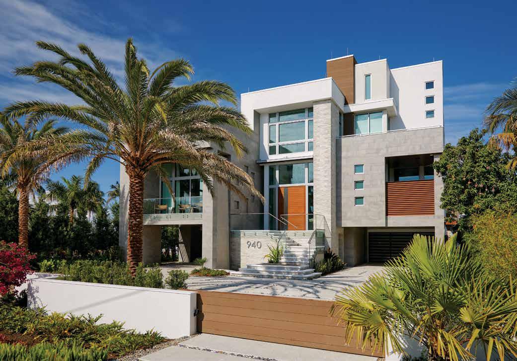 Front Elevation (Previous Spread): “I like to use diverse materials and elevations to guide the eye across the architecture,” shares Alberto Abad, Design Principal of New Architectura, who crafts a dynamic exterior that Minka McDonald, President of Jinx McDonald Interior Designs, dresses in warm white with a contrasting metal roof. For this coastal modern home, strong horizontal lines, cantilevered eyebrows over the windows, and textural ledgestone converge to create a layered dimension. Senior Project Manager Philip McHenry of Architectural Land Design appreciates how the footprint reserves land for a garden courtyard, making the landscape a discoverable experience.
