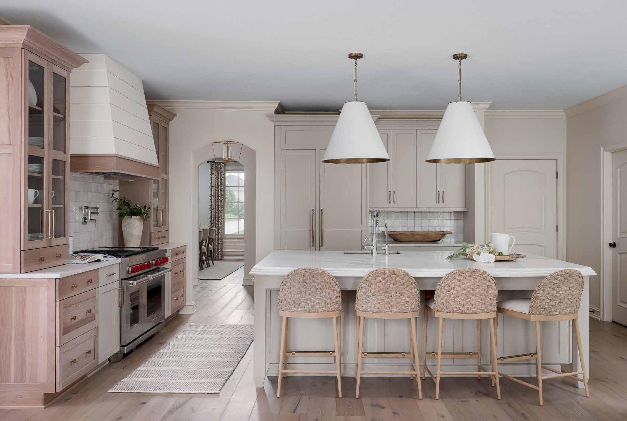 The soft sandstone and white palette of the cabinetry — crafted by High Tide Cabinetry & Design — becomes dynamic when contrasted with the black glass-front cabinets set atop the Mystery White marble countertop, all complemented by premium appliances sourced through Fuse Specialty Appliances. Gnarled dual-toned Emtek pulls in matte black, along with three Regina Andrew pendants, carry the drama through.