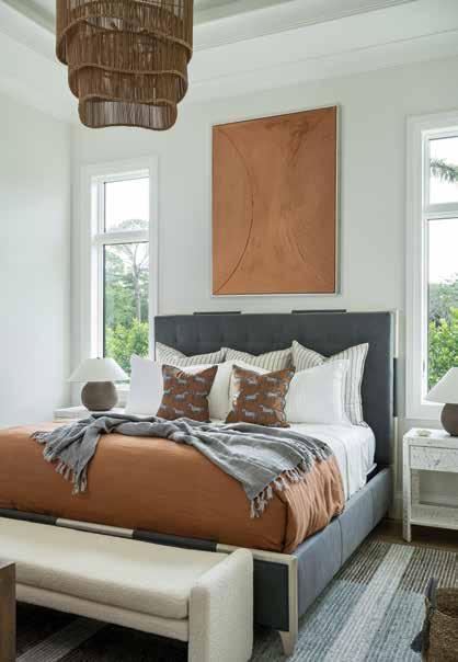 McDonald weaves in neutral botanical prints, a twig-form light fixture, and a palm-frond-style framed mirror, along with other accents that subtly affirm the home’s Florida setting. Yet the design is more than decor — she forgoes traditional window casings and trim so openings read clean and modern, while mitered-nose stairs offer a precise, tailored detail. Both are deliberate choices in achieving a sophisticated look well-suited to Marco Island.
