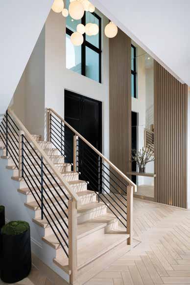 Entry & Stair Tower: One wouldn’t expect a single interior step to shape the home’s exterior, but here, it eliminates the need for outdoor railings — a clever accommodation that preserves clean lines on the exterior, and a frame for a luxury entry rug from International Design Source. Natural light streams through black-framed 400 Series windows and a pivot door from Andersen Windows & Doors — sourced through Florida Wood Window & Door — illuminating McDonald’s mitered-nosing stair detail and bold geometric black railings, while overhead, a unique chandelier evokes sea birds in graceful flight.