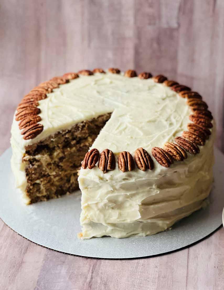 Prepare the Cake Layers: Preheat oven to 350°F. Whisk together flour, sugar, salt, baking soda, and cinnamon in a large bowl; add eggs and oil, stirring just until dry ingredients are moistened. Stir in vanilla, pineapple, bananas, and toasted pecans. Divide batter evenly among 3 well-greased (with shortening) and floured 9-inch round cake pans. Bake in preheated oven until a wooden pick inserted in center comes out clean, 25 to 30 minutes. Cool in pans on wire racks 10 minutes. Remove from pans to wire racks, and cool completely, about 1 hour. Prepare the Cream Cheese Frosting: Beat cream cheese and butter with an electric mixer on medium-low speed until smooth. Gradually add powdered sugar, beating at low speed until blended after each addition. Stir in vanilla. Increase speed to medium-high, and beat until fluffy, 1 to 2 minutes. Assemble Cake: Place first cake layer on a serving platter; spread top with 1 cup of the frosting. Top with second layer and spread with 1 cup frosting. Top with third layer and spread remaining frosting over top and sides of cake. Arrange pecan halves on top of cake in a circular pattern.