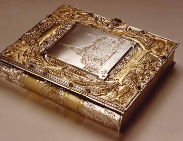 -then shipped to Moscow for Crockett to add Ruby Creek rubies and opals from surrounding mines. The Columbian Club fundraised to pay for the book and displayed it for Moscow residents to view after the fair. They then donat ed it to the University. The book was in the President’s Office when in 1906, the Administration Building burned. The book was one of two items saved from the flames. It remains in the President’s Office in the “new” Administra tion Building.