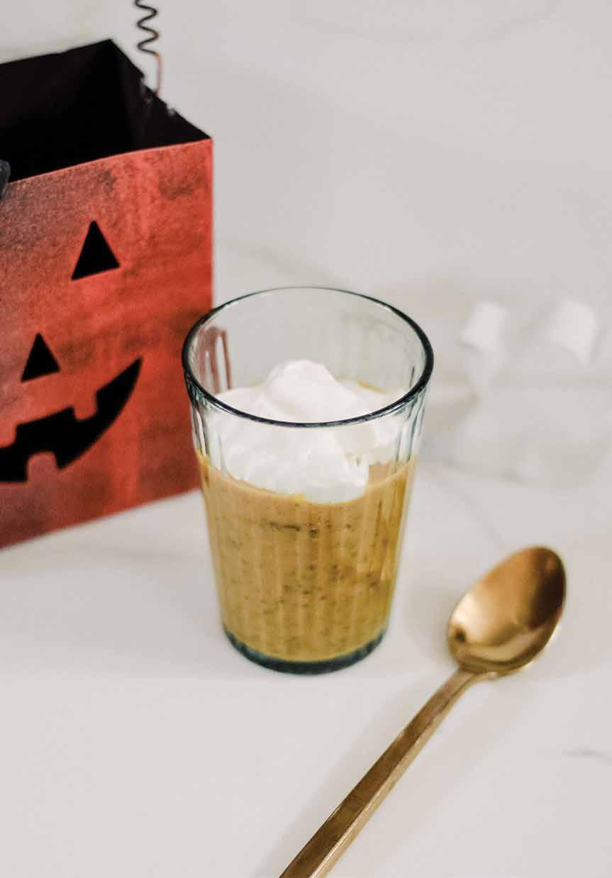 Blend the purée, milk, syrup, salt, and cinnamon in a blender for 1 minute. Add the chia seeds, transfer to an airtight container, and refrigerate for a few hours. Remove and top with whipped cream. Happy Halloween!