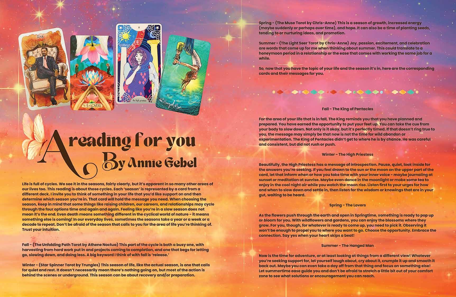 I want this magazine to always remind you that life is rich, diverse and wonderful and I hope you always see this in our pages. Articles that touch on prayer next to a tarot or oracle reading, steak grilling articles placed before a vegetarian writer’s story. We all share this community and I hope we continue to release the expectation of one vision and instead, celebrate what is and will always be, a vibrant mix of individuals sharing the planet in this time space.