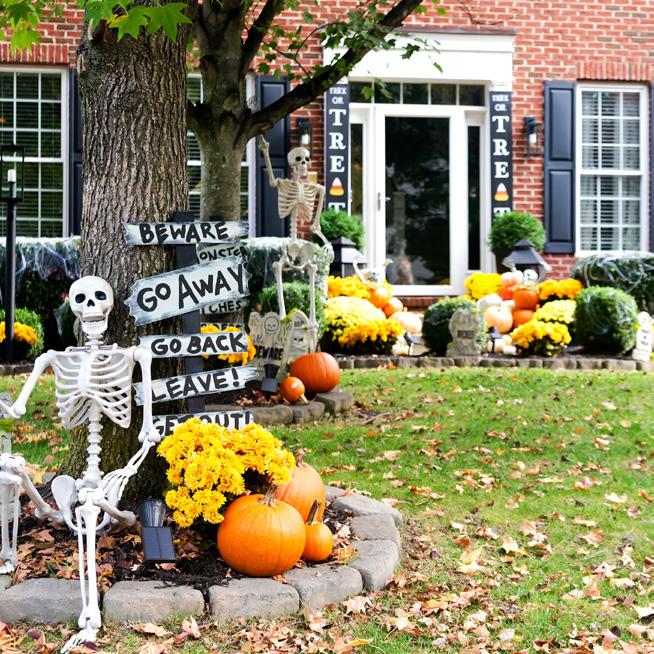 1. Spooky Entryway: Change up your entryway and turn it into something more sinister. Adorn your front door and patio area in cobwebs, headstones, and creepy skeletons. This sets the tone for your home and will have party guests wondering if they should have ignored the RSVP for your Halloween party!