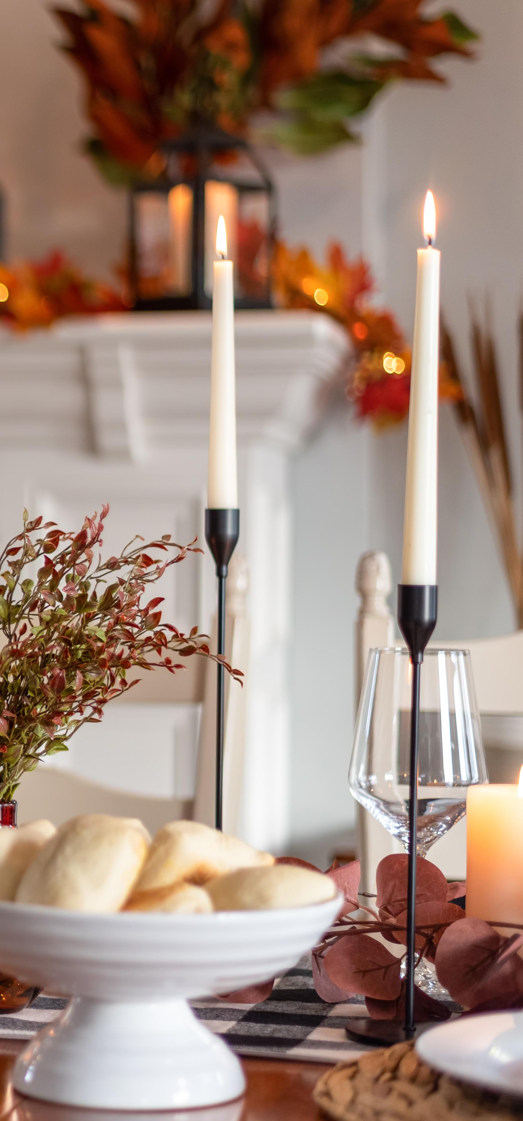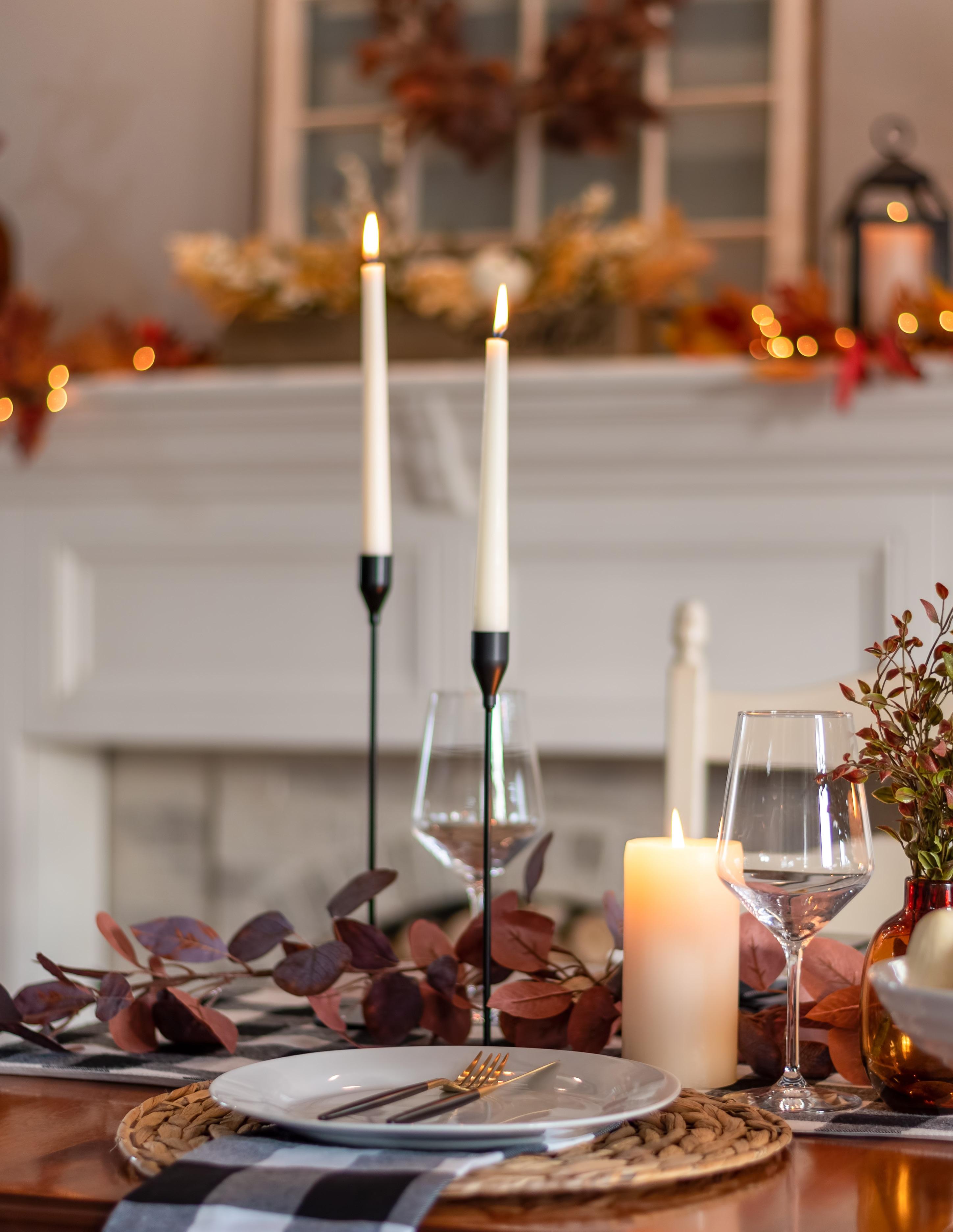 Your centerpiece is the visual focal point of the table. Opt for natural elements like a harvest-inspired floral arrangement, garlands of eucalyptus, or clusters of faux pumpkins. Add height and dimension with candleholders
