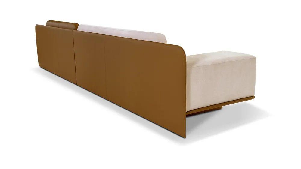 A linha Sela possui estrutura de aço com contenções laterais e encosto de couro culatra de curtume vegetal. Com dimensões reduzidas e excelente conforto, é composto por partes que se acoplam entre si, podendo alcançar grandes dimensões sem transtornos na sua logística. Capas de tecido removíveis facilitam a lavagem e conservação. 240cm