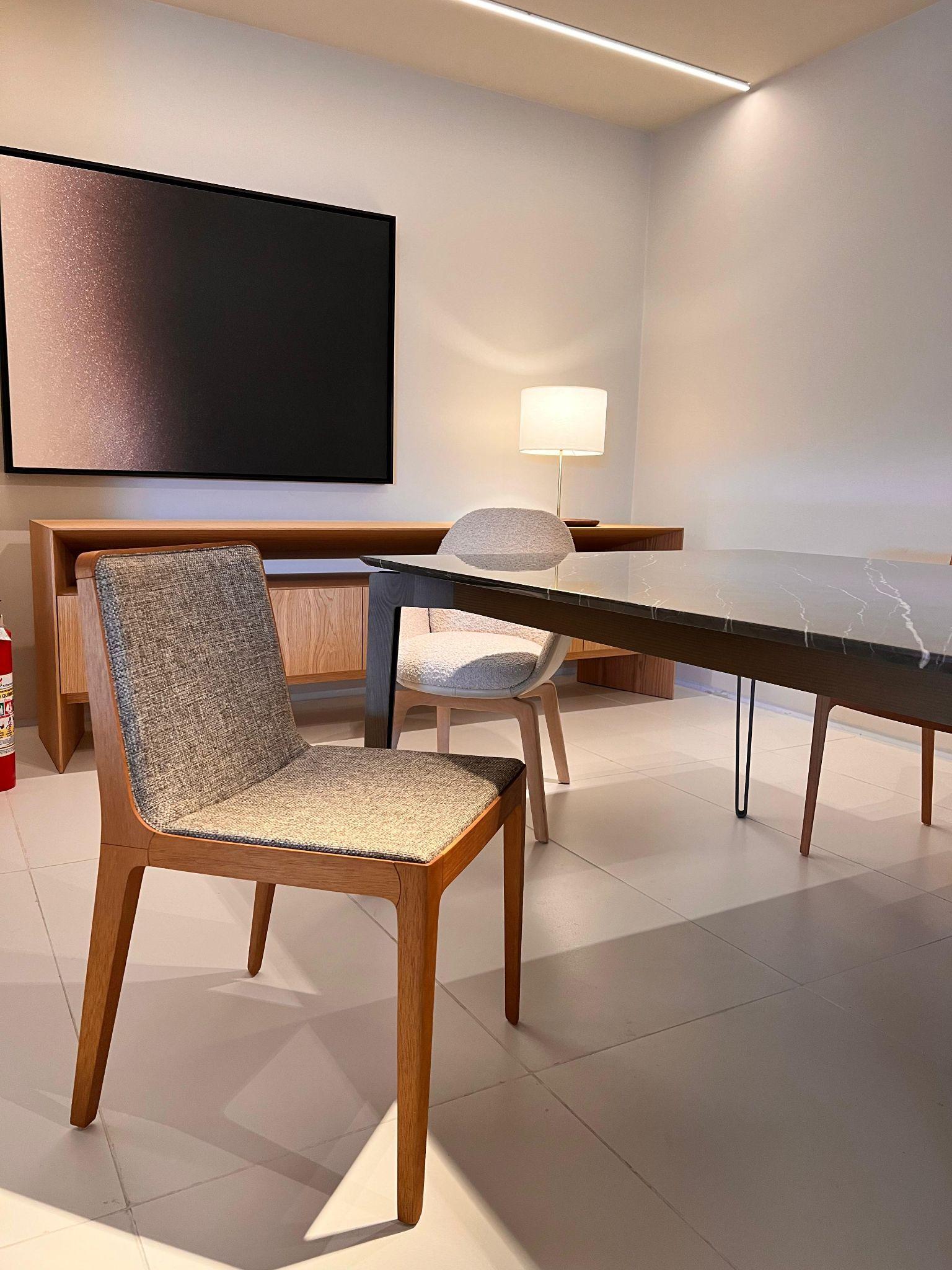 A Cadeira Bossa com braços traduz com delicadeza o pensamento de Jader Almeida, onde o design se constrói a partir do ritmo, da proporção e do silêncio. Assim como a bossa nova que inspira seu nome, a peça se revela nos detalhes sutis, nos gestos contidos e na elegância que não precisa se impor.