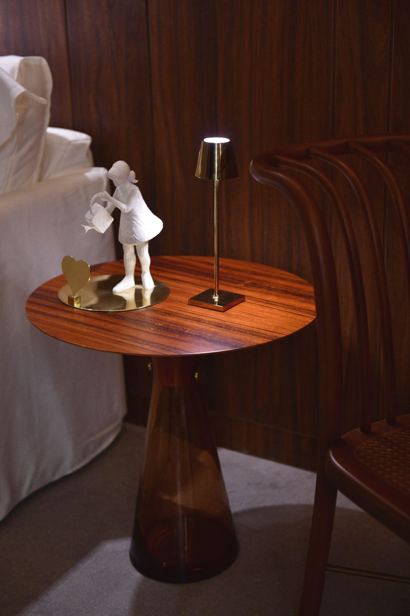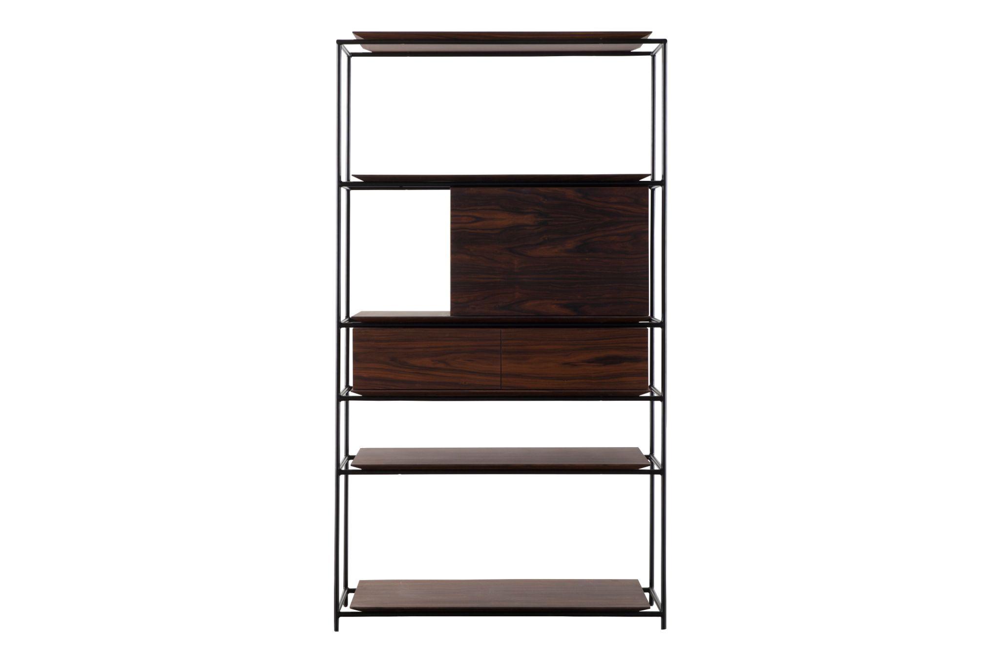 Com uma pegada anos 80, o sofá Lui traz um rigor na sua forma que é quebrado pela assimetria e pela variação dos braços, ora redondo, ora materializado em um generoso bloco retangular. A estrutura do sofá, toda revestida no próprio couro, já oferece o apoio necessário em uma das laterais, fazendo as vezes de mesa em chapa de aço dobrada e revestida com lâmina natural de madeira.