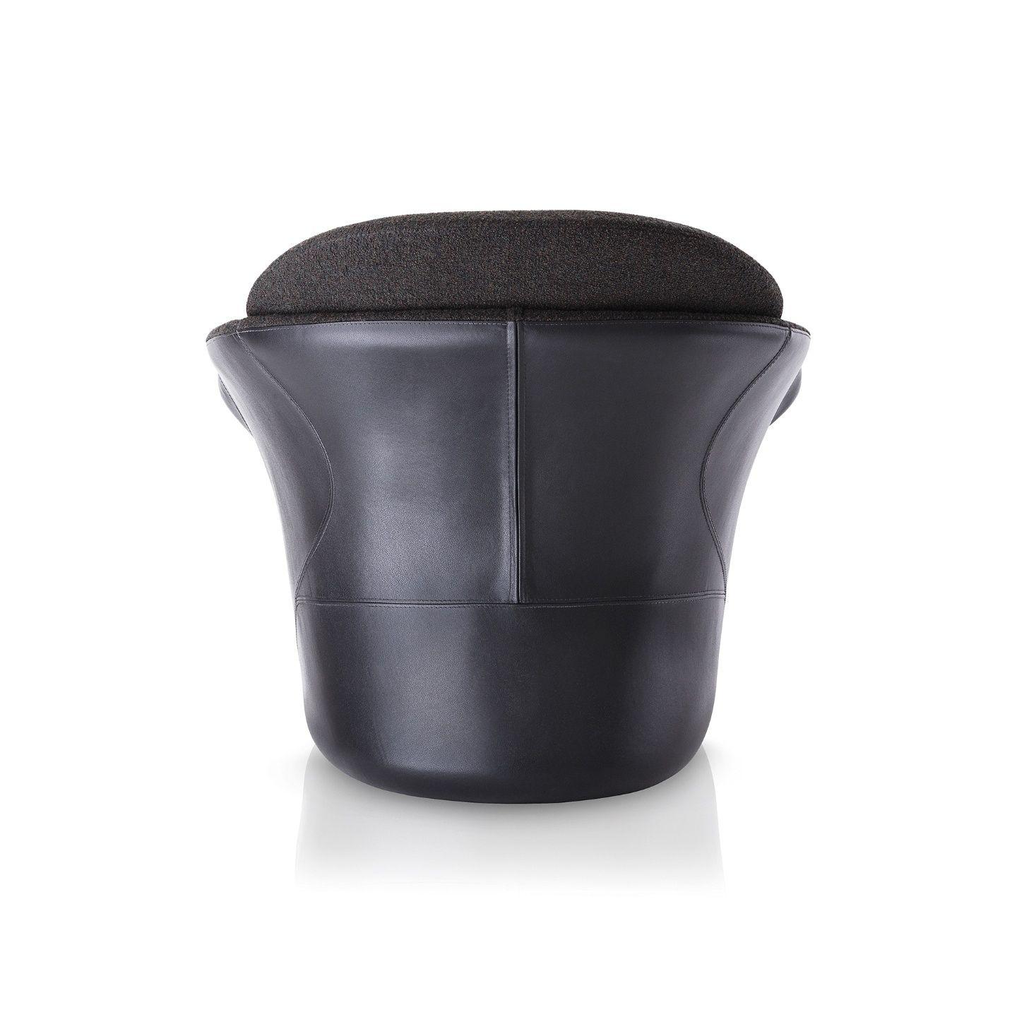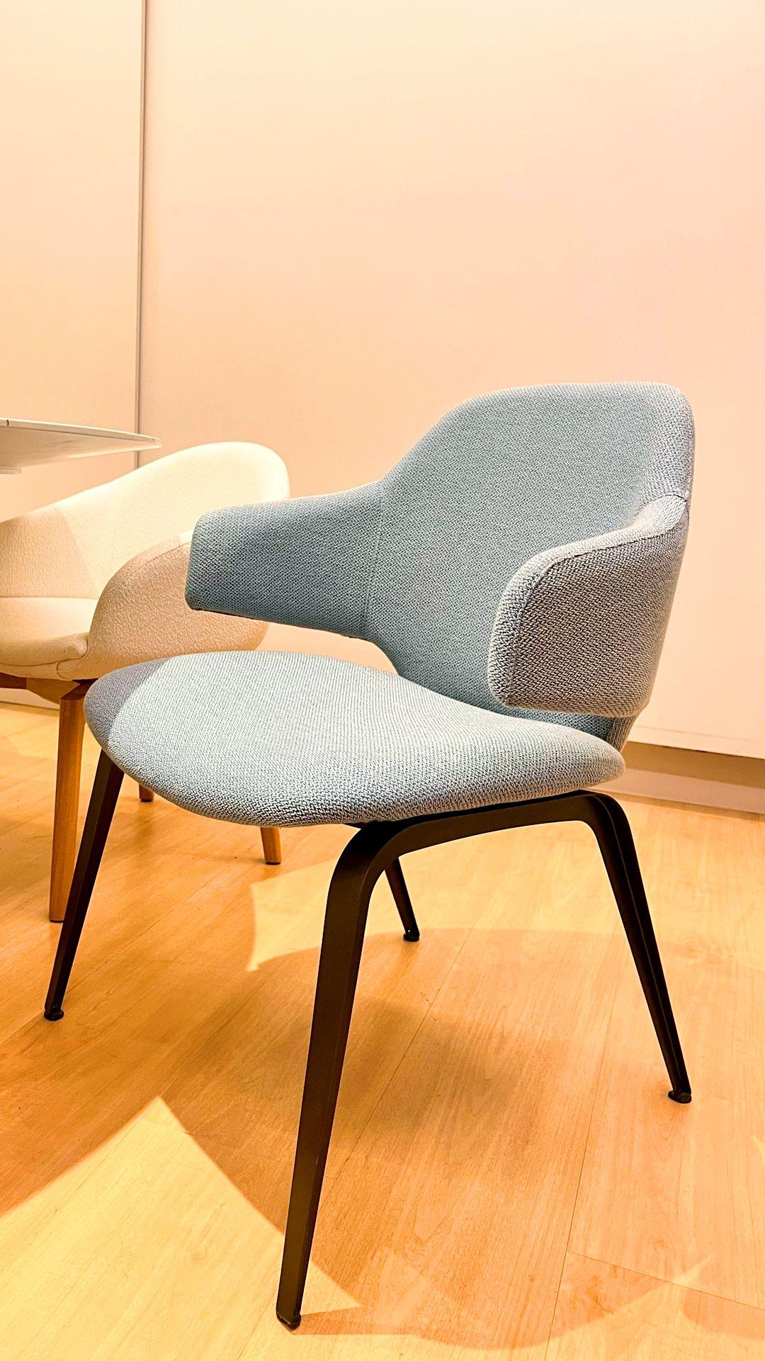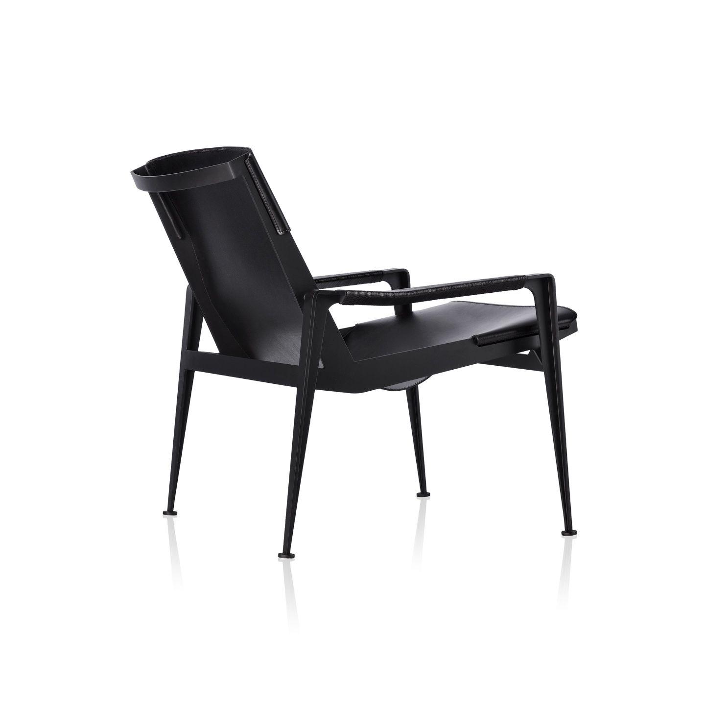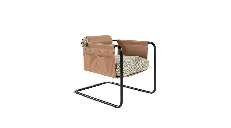 Jet Set, a poltrona amplia o conforto e rigidez por meio da adição de apoios de braço e da extensão de sua base em aço inox.