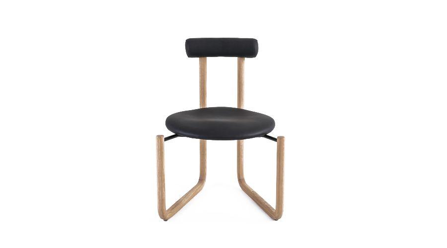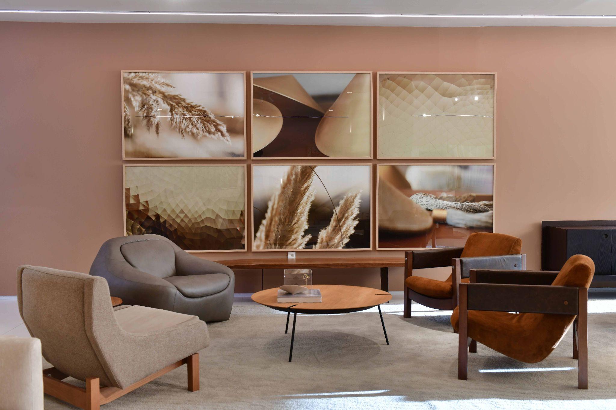 Com formas geométricas e volumes compactos, a Linha Curva se organiza na combinação da madeira com o couro e deixa clara sua função de ergonomia e conforto.