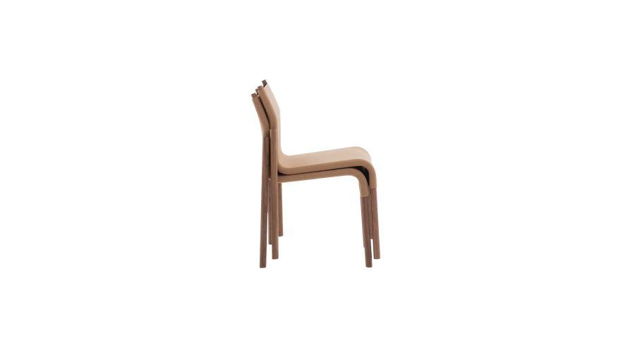 Esta cadeira empilhável tem estrutura de aço e é revestida por um tecido que fica completamente esticado, brindando o conforto pelo tensionamento. Leve ao olhar e no peso, possui estrutura forte e resistente. A parte visível é toda de madeira maciça torneada. Revestimento em couro ou tecido.